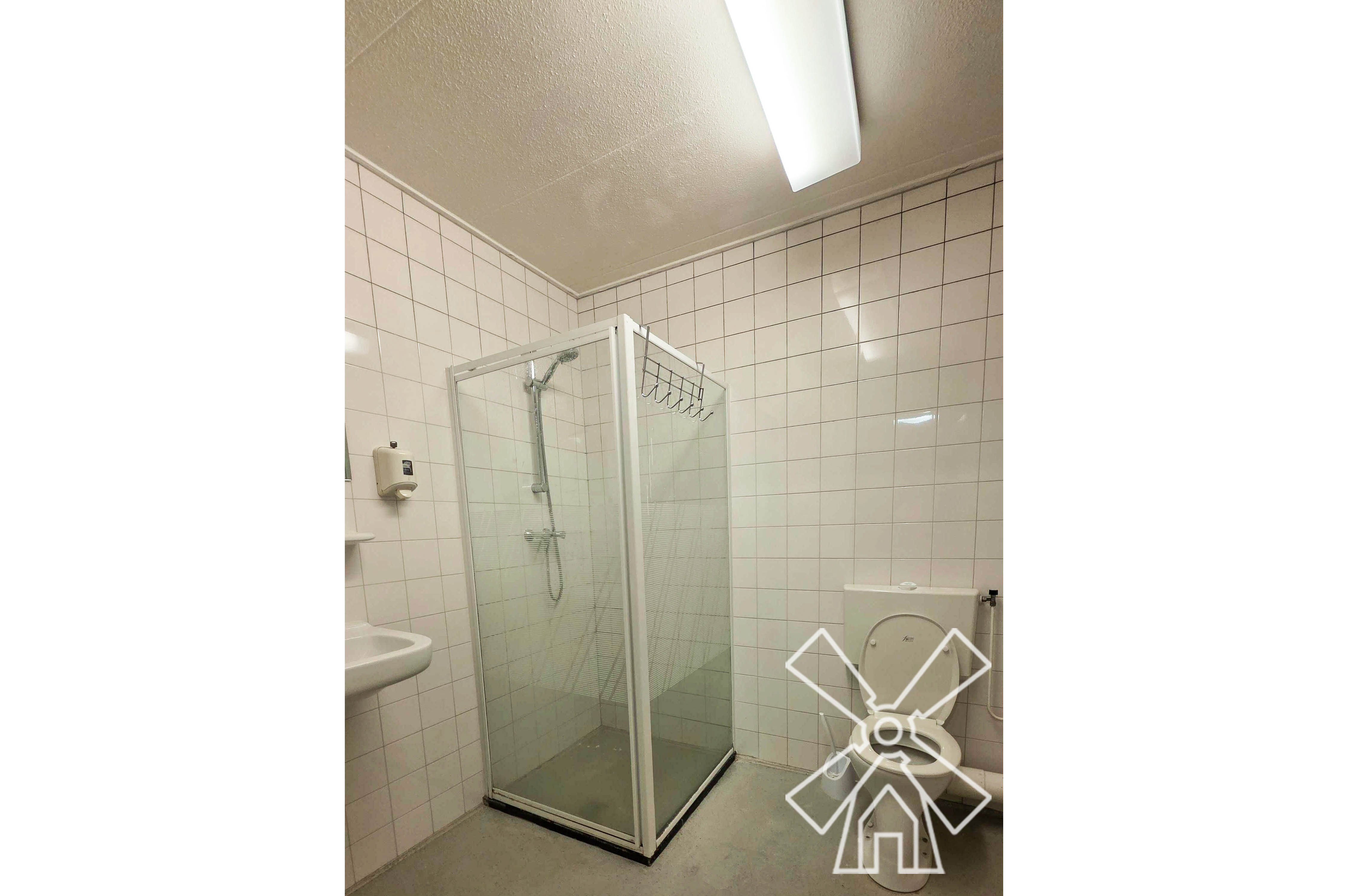 This accommodation features a slanted ceiling and light gray flooring, furnished with a single bed, a two-door wardrobe, a desk with an office chair, and a small side table. More features include a desk lamp, a floor fan, and a radiator installed below large windows with curtains. The compact utility area includes a cabinet with a stainless steel sink and countertop, a microwave, and a wardrobe. Sections of vertical wooden slats are visible behind the bed. In addition, the bathroom features white tiled walls, a glass-enclosed shower, a toilet, and a sink.