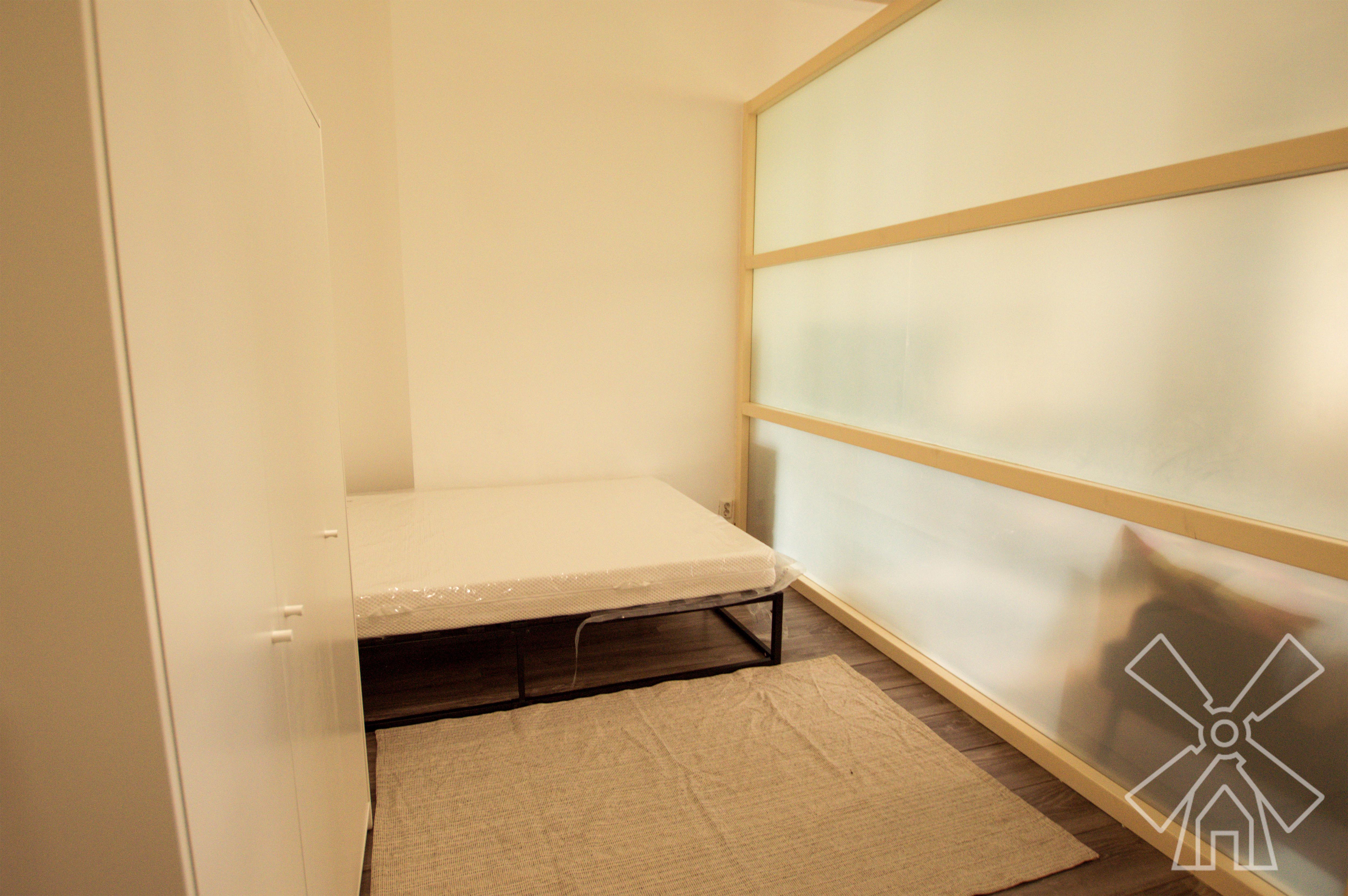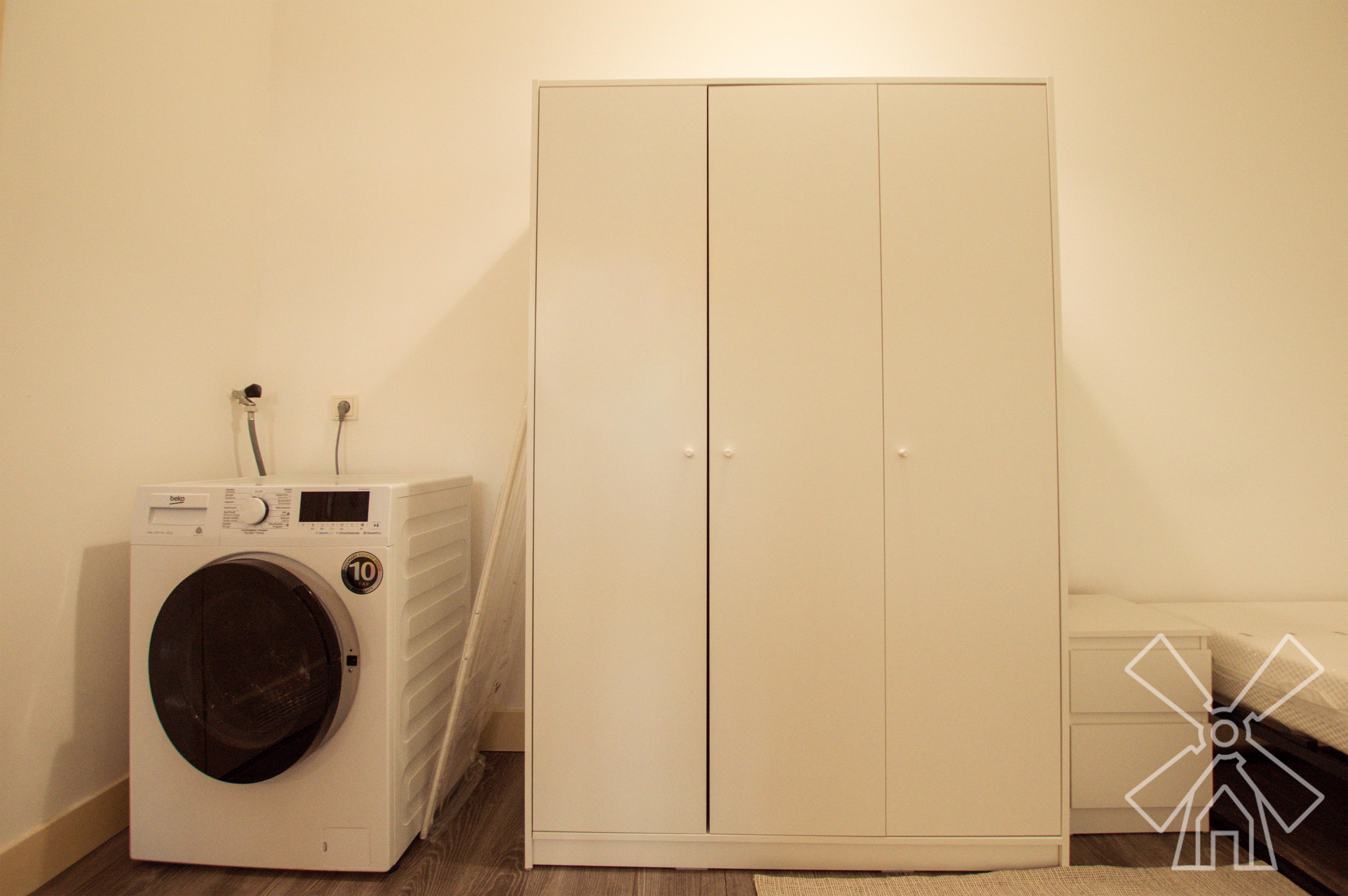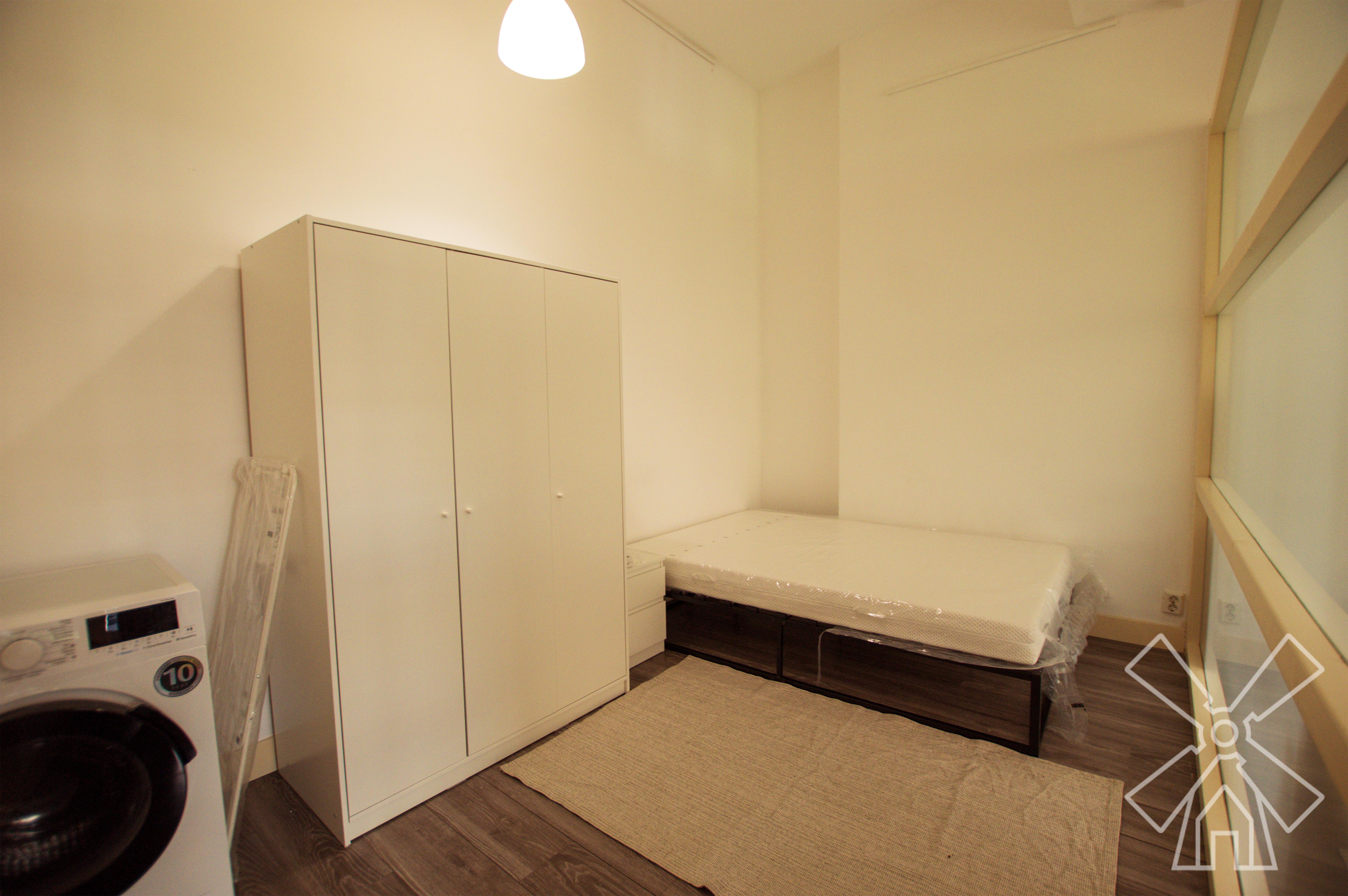 The sleeping area is efficiently laid out with a cozy bed, and a separate closet offers plenty of space for your clothes and belongings. The clean, modern bathroom is equipped with a shower, toilet, and sink, plus a washing machine for added convenience. This studio is designed to be a comfortable and functional home, providing a great base for your student life.