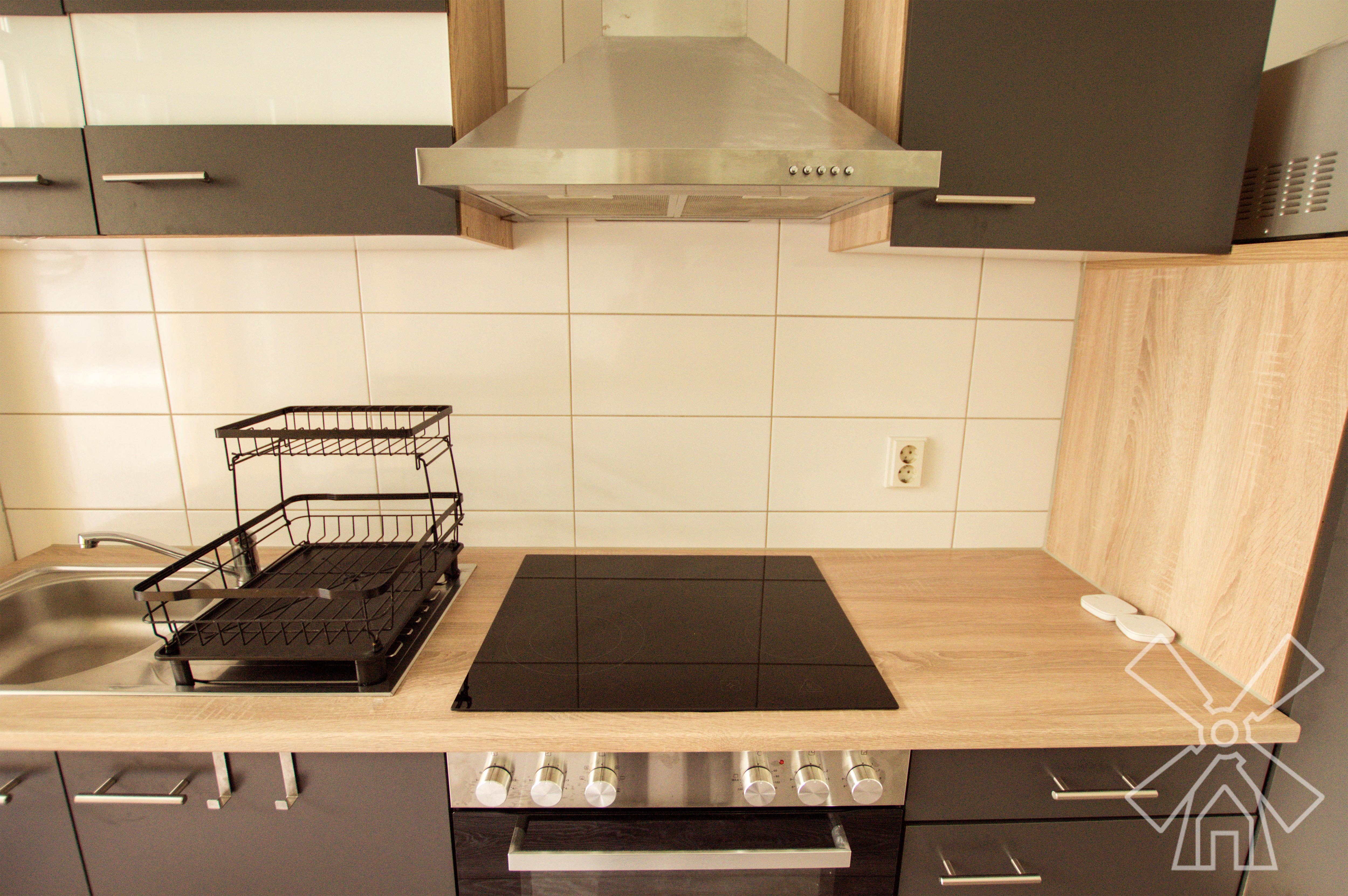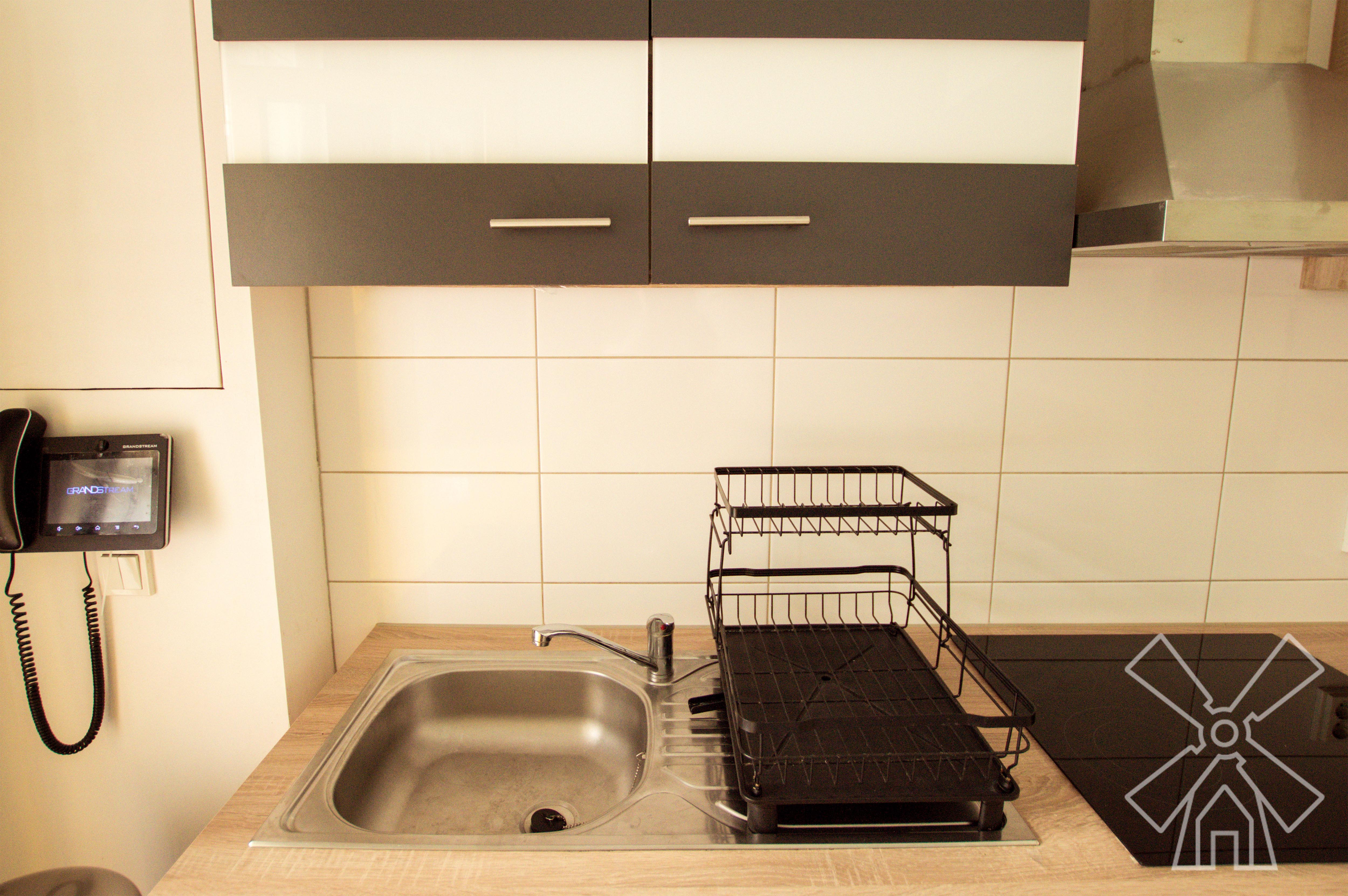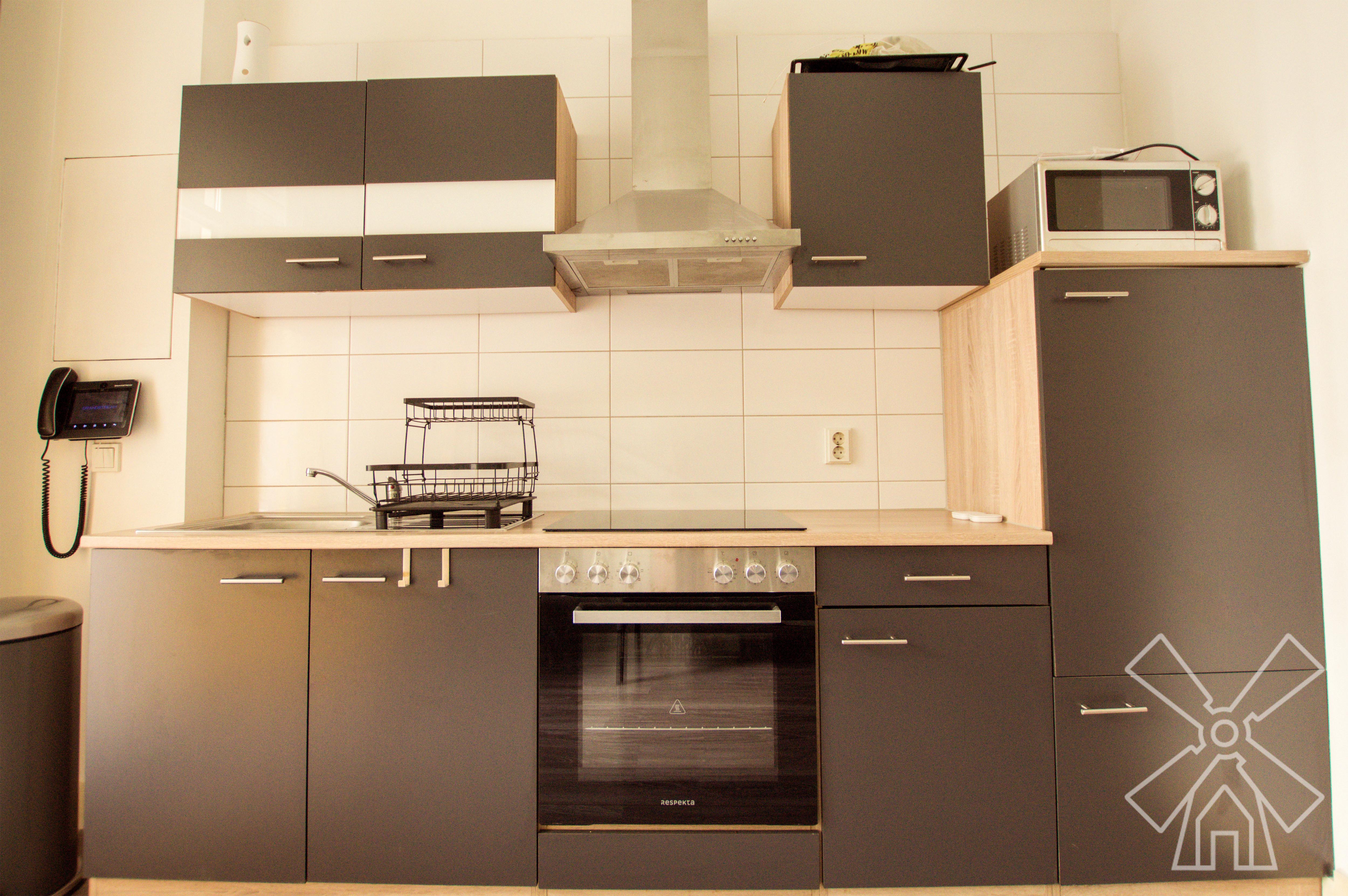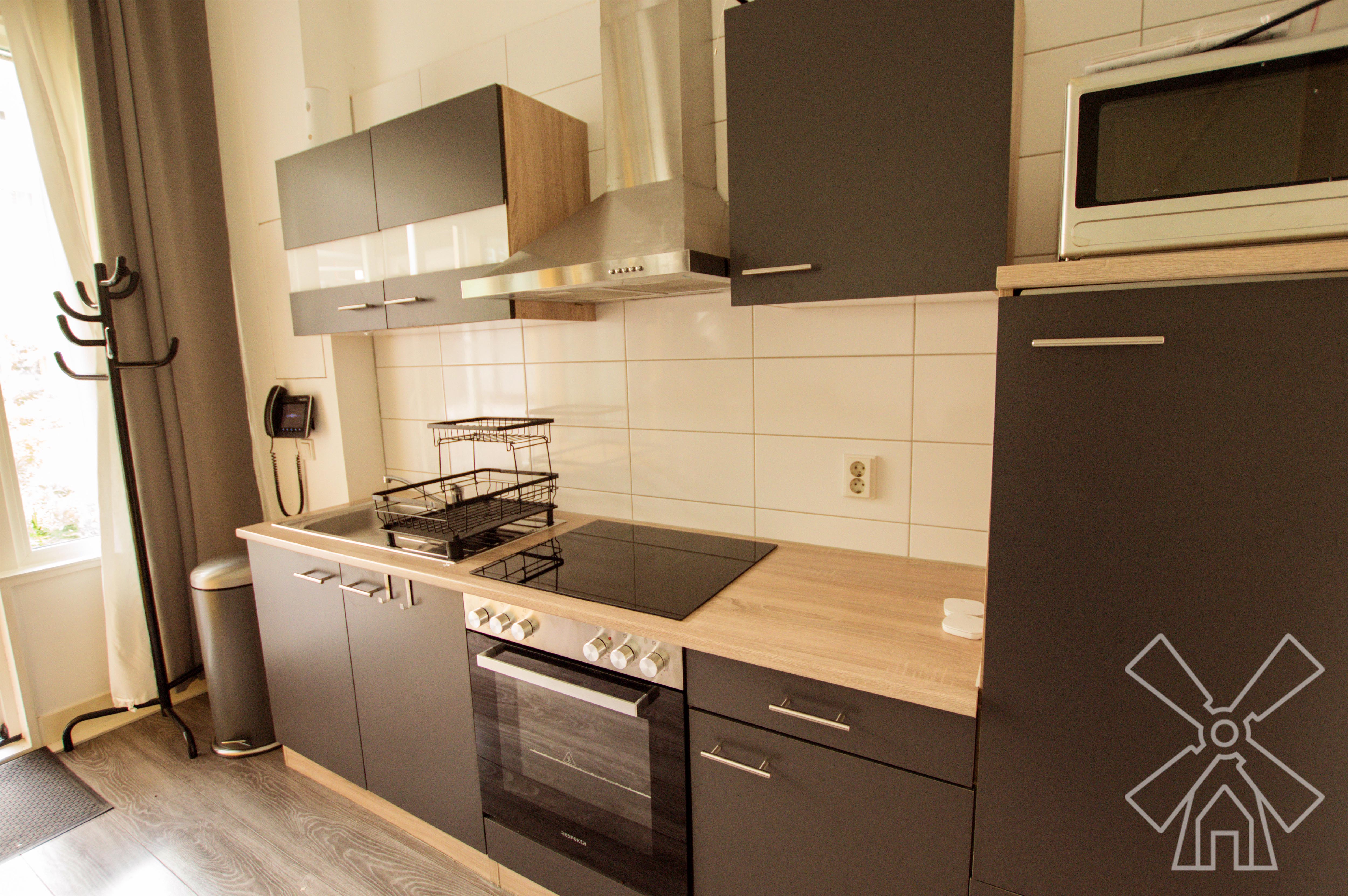This bright and modern studio is the perfect home for 2 international working professionals. The open-plan living area is filled with natural light from large windows, creating a warm and welcoming space. The living area features a comfortable sofa and a TV on a stand, along with a dining table and chairs, making it easy to relax, study, and enjoy meals. The compact kitchenette includes a stovetop, oven, and sleek cabinets, providing everything you need for cooking.