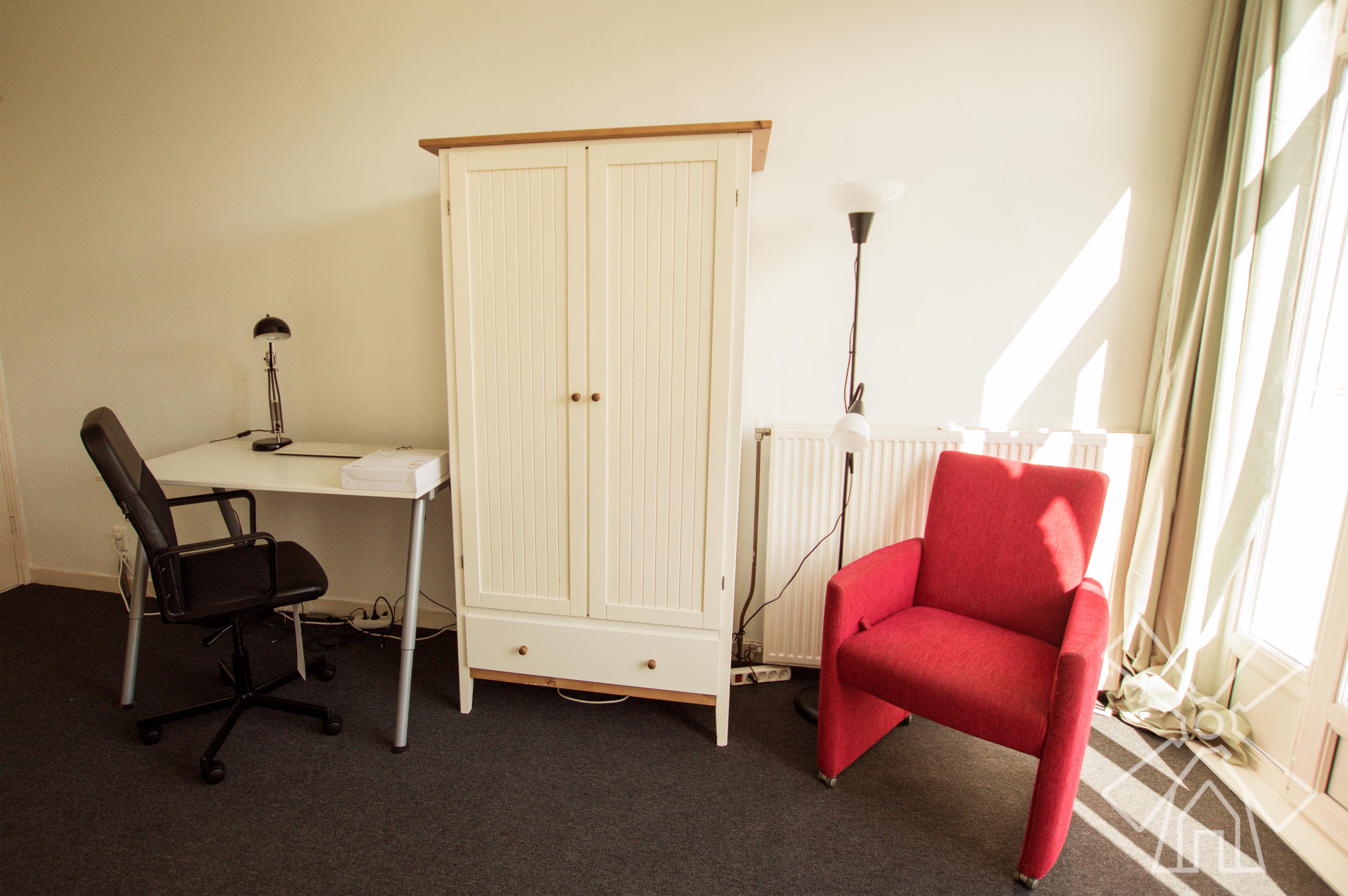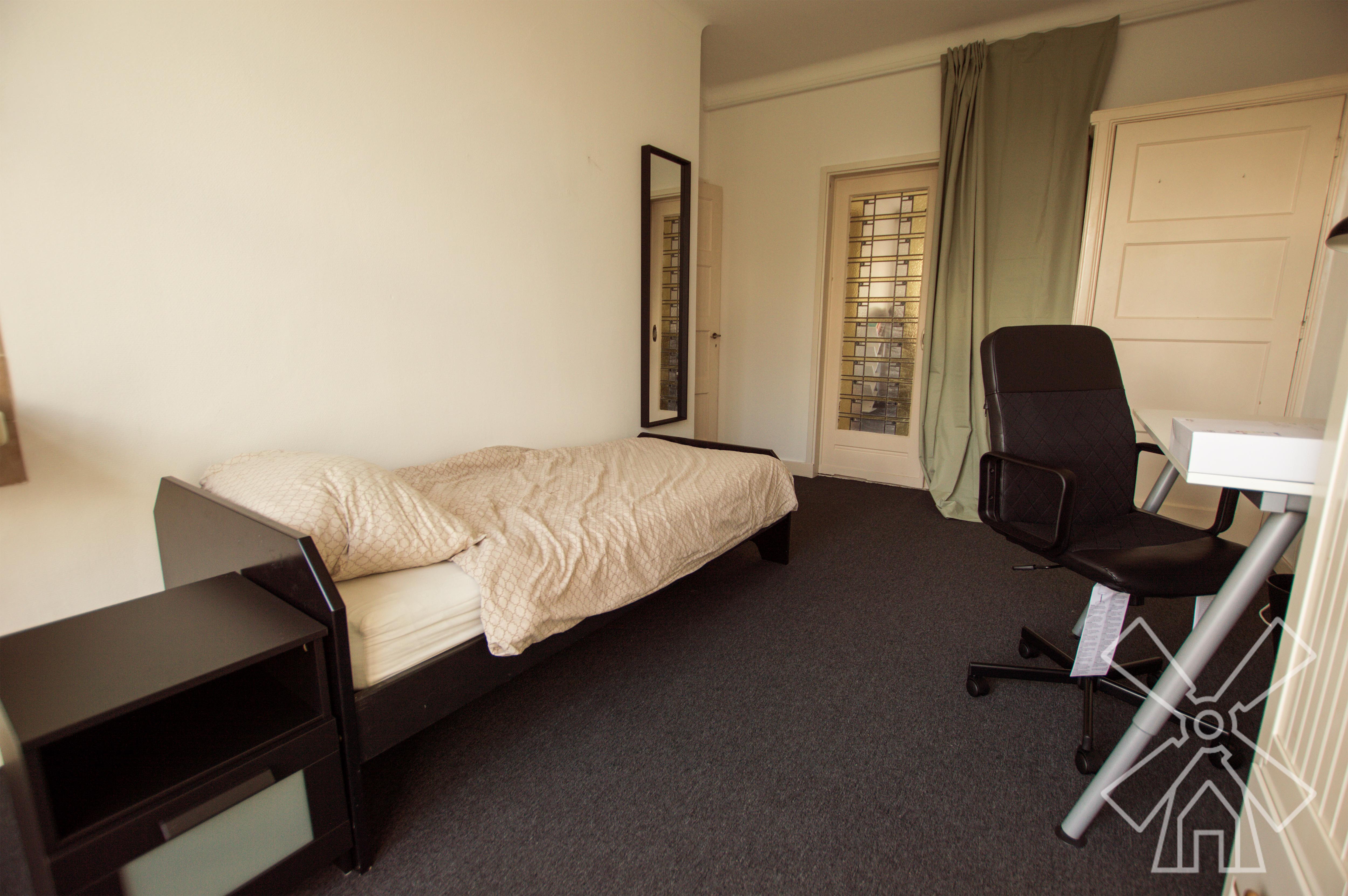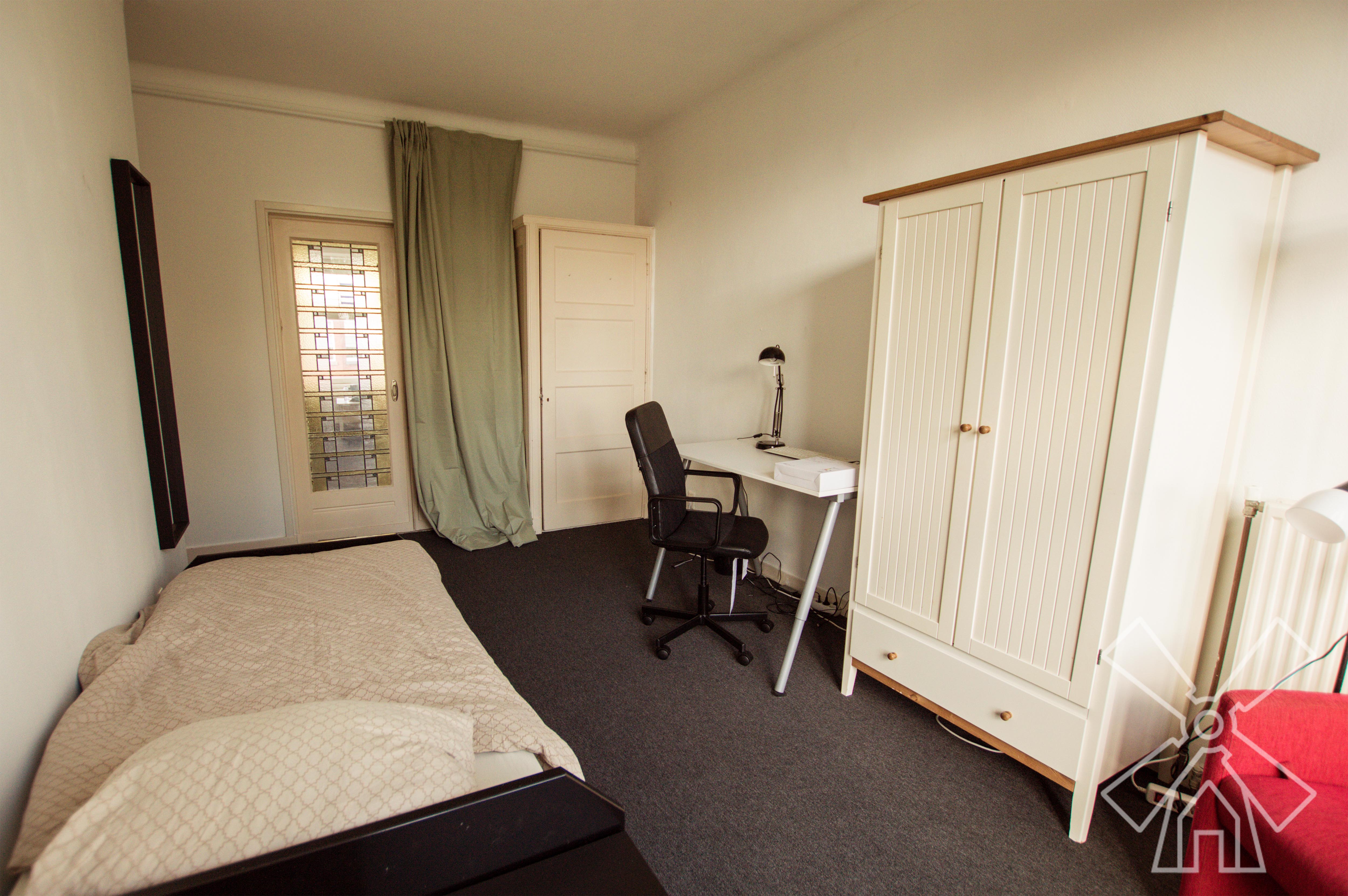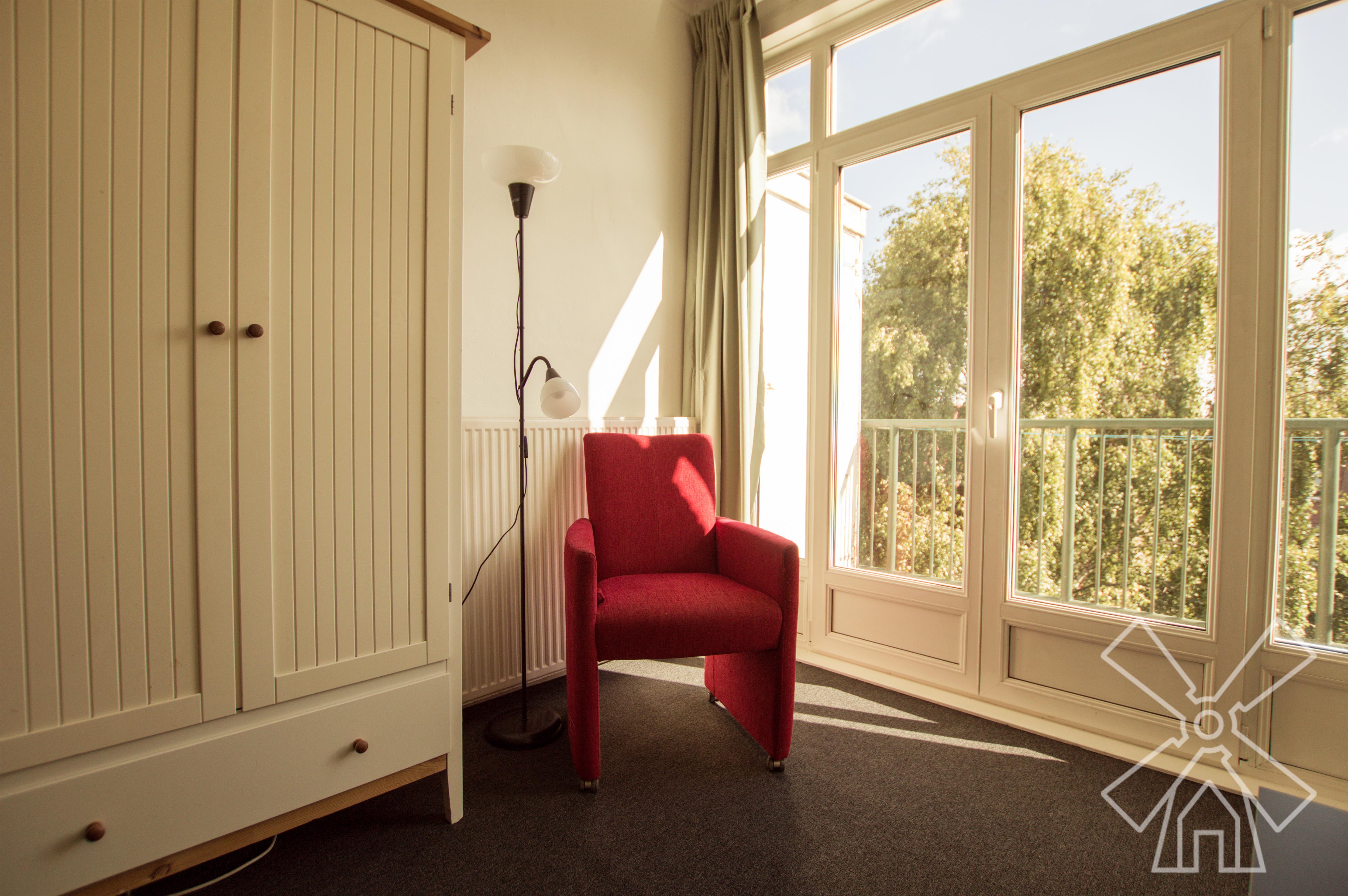 Private bedroom: furnished with a bed and mattress, desk with lamp and chair, wardrobe, and an additional armchair. Large windows provide plenty of natural daylight and access to a balcony with a pleasant neighborhood view.