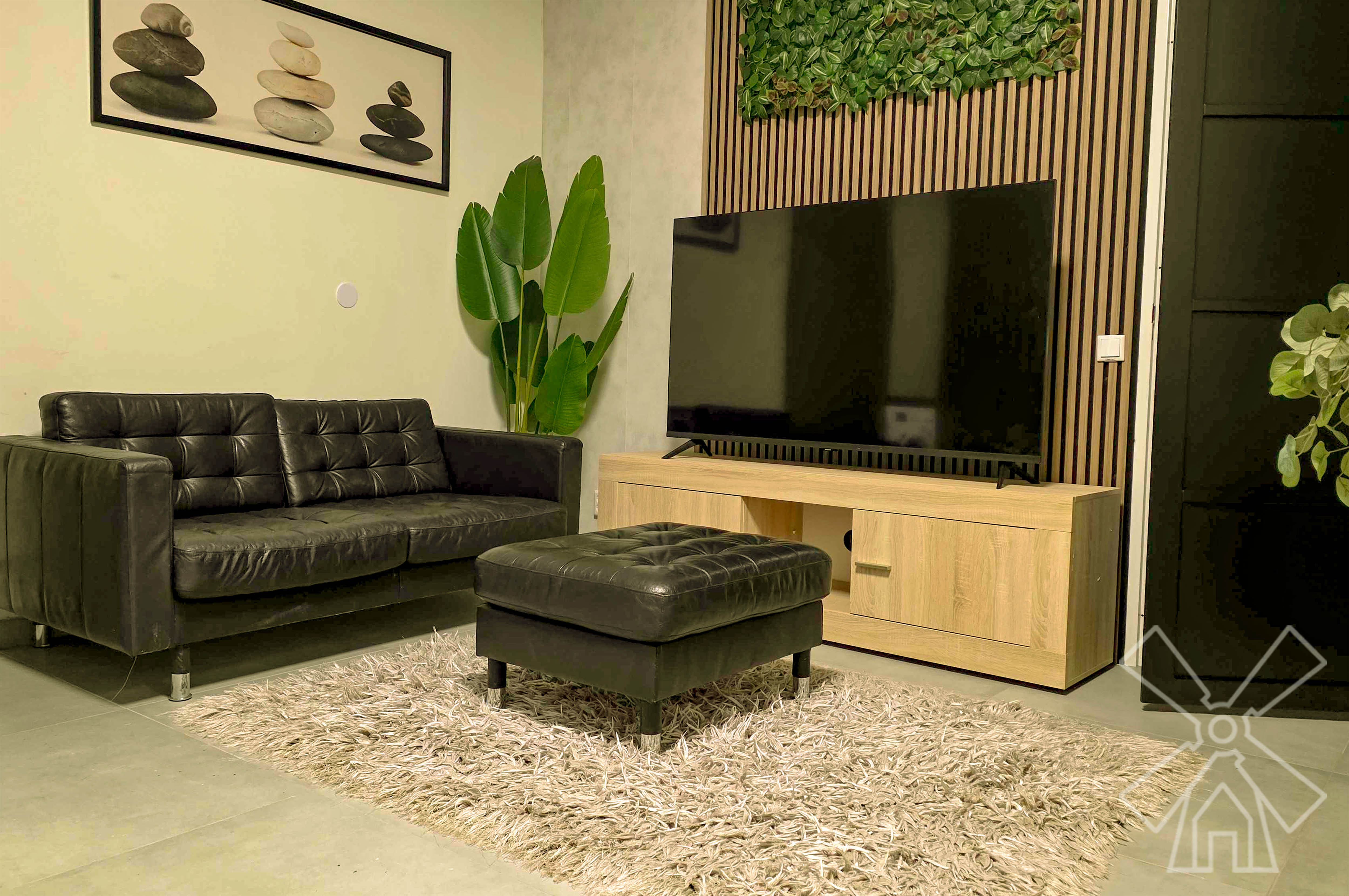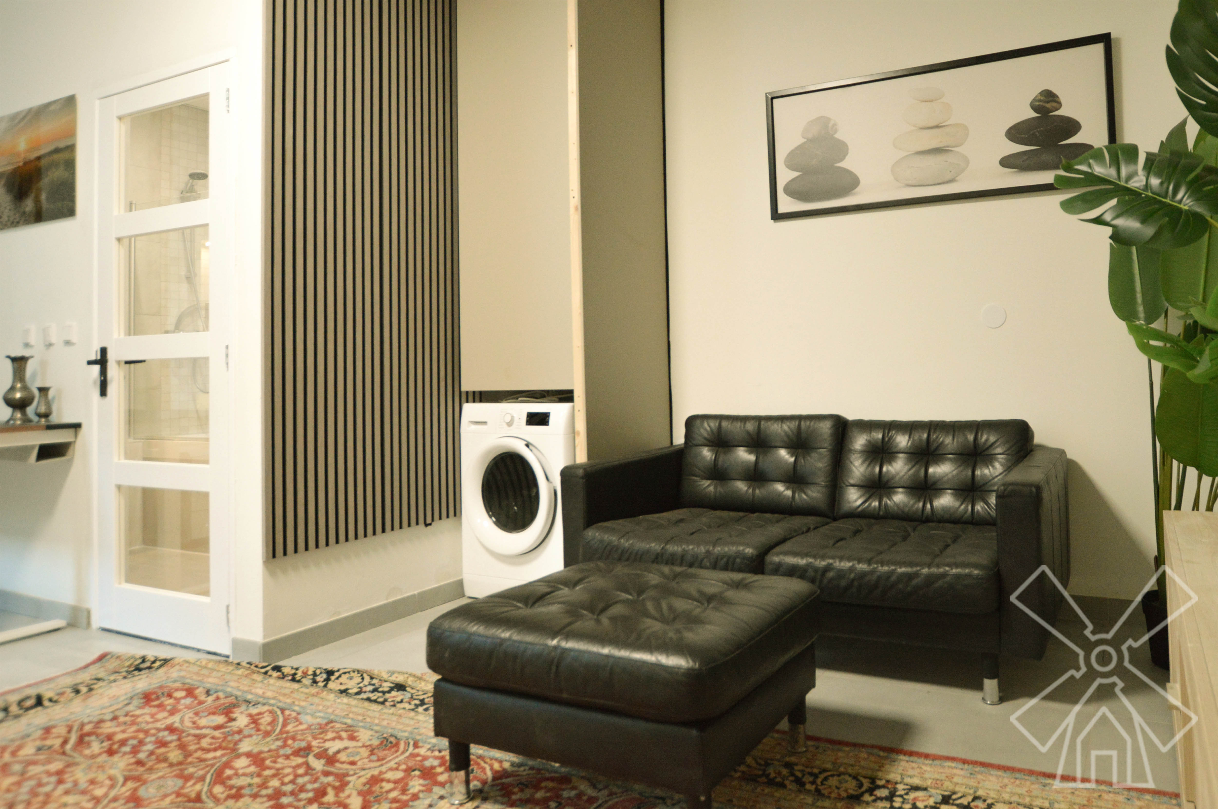 This modern semi-studio is bright and airy, featuring a comfortable bed, bedside cabinet, and a three-door wardrobe with a full-length mirror. The living area includes a black leather sofa with ottoman, while the fully equipped kitchen features sleek cabinetry, appliances, and sink. The bathroom is finished with tiles, a wall-mounted toilet, and a bathtub with glass shower screen. Large windows with curtains, indoor plants, framed artwork, and a washing machine complete this stylish and practical space.
